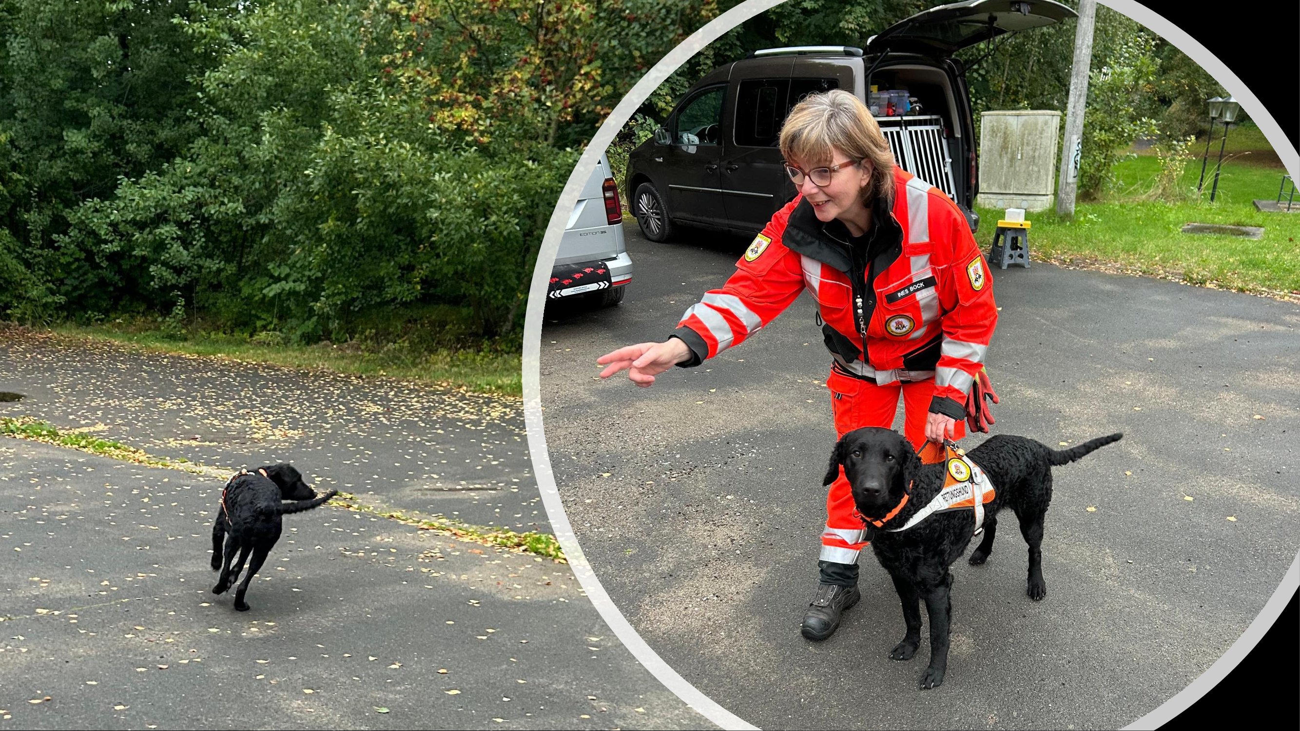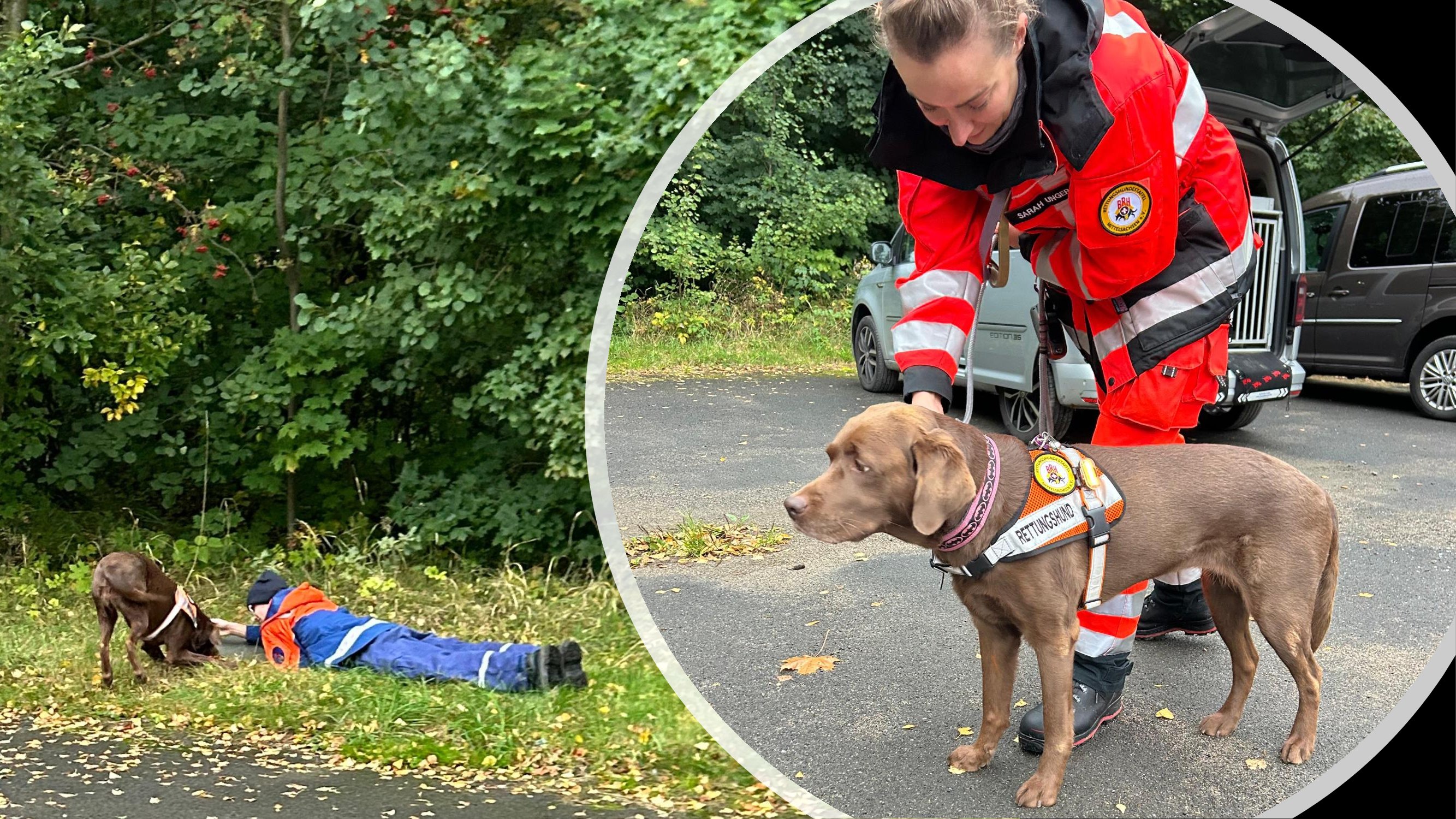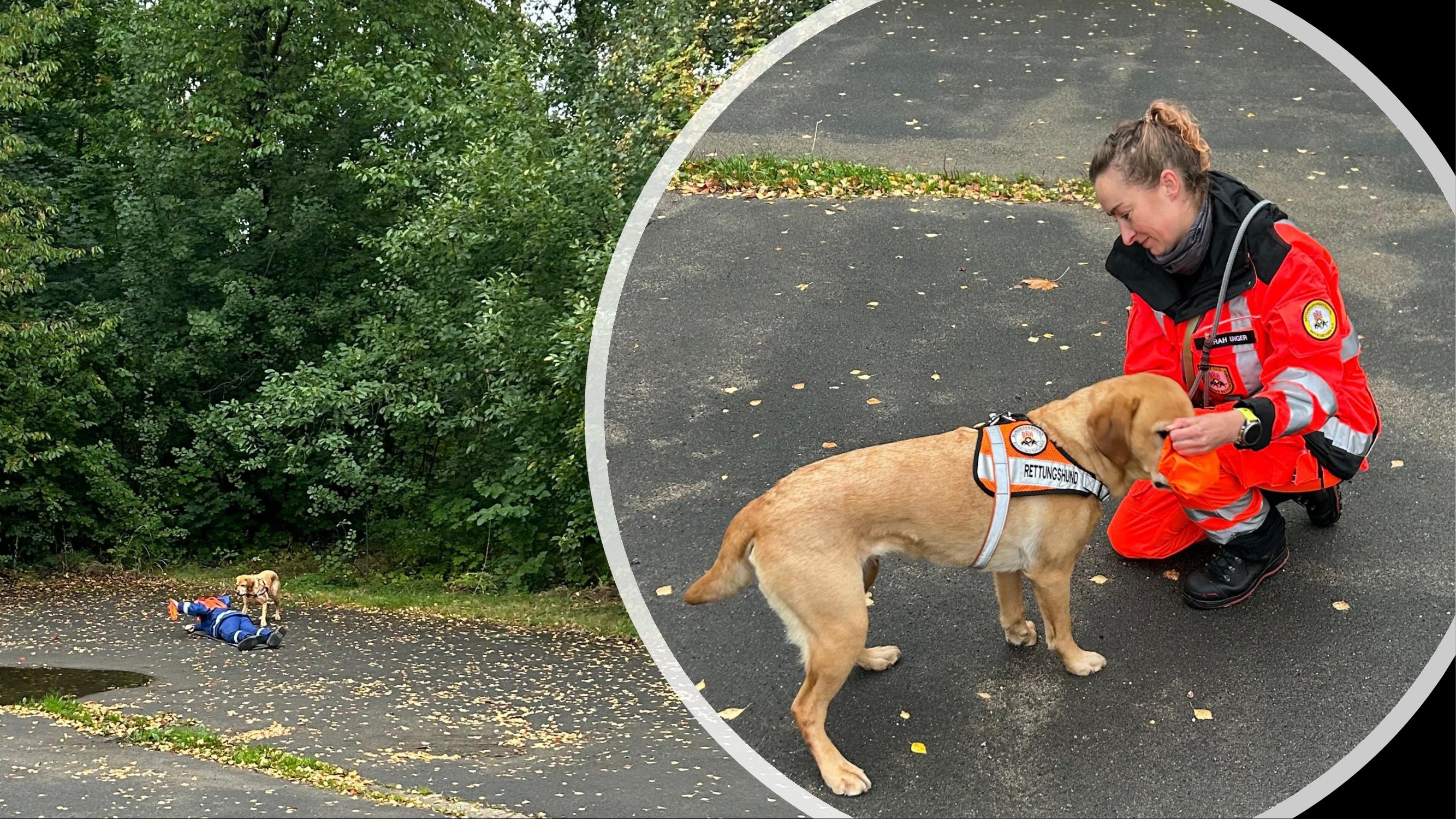 die Zusammenarbeit von Hundeführer:in und Suchtrupphelfer:in,